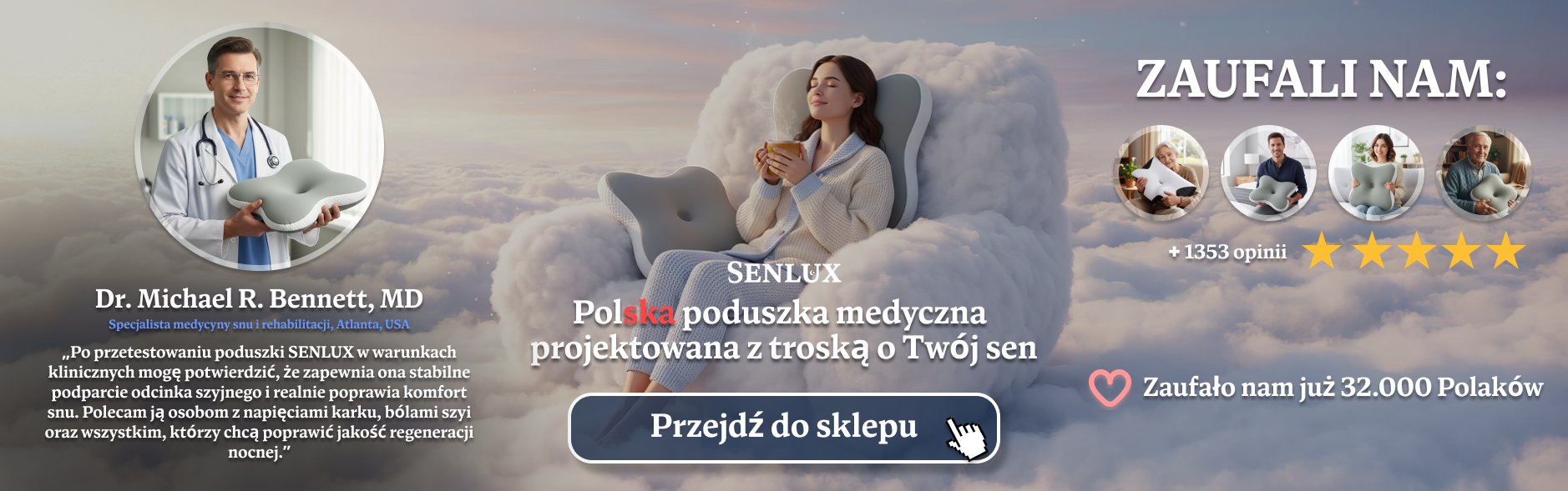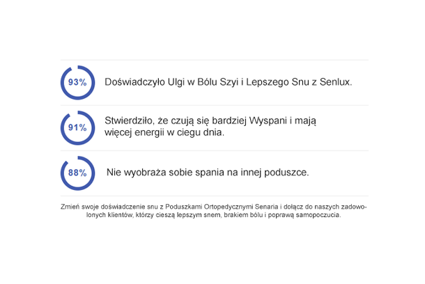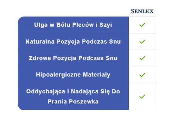 Dzięki unikalnej, ortopedycznej konstrukcji poduszki SENLUX, Twoja szyja i kręgosłup są naturalnie ustawione podczas snu. Łatwiej zasypiasz, ciało się rozluźnia, a ból stopniowo ustępuje noc po nocy.
