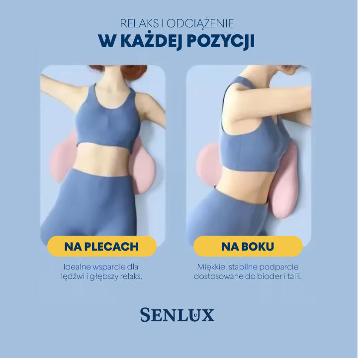 Długie godziny spędzone w jednej pozycji mogą obciążać dolną część pleców, powodując sztywność i dyskomfort. Ta ergonomiczna poduszka została zaprojektowana tak, aby delikatnie dopasowywać się do naturalnej krzywizny kręgosłupa, zapewniając stabilne i miękkie podparcie. Zmniejsza napięcie, pomaga zachować zdrowszą pozycję podczas leżenia i umożliwia pełniejsze rozluźnienie mięśni.